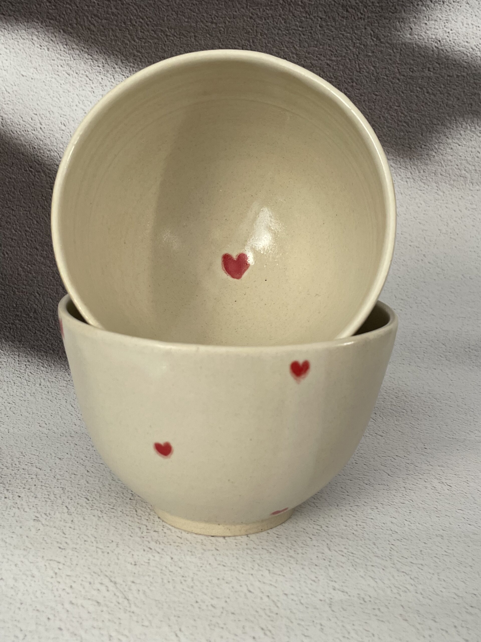 Sa couleur de base est un beige naturel, légèrement nuancé par des variations subtiles typiques du grès. Tout autour du bol, des petits cœurs rouges, peints à la main, viennent apporter une touche chaleureuse et poétique. Certains sont bien nets, d’autres semblent légèrement fondus dans l’émail, comme s’ils constituent partie intégrante de la matière.
